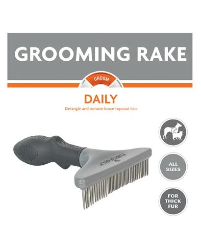 The FURminator® Grooming Rake grooming rake for pets with thick hair removes loose hair, tangles and prevents knots. Use daily for 5 to 10 minutes per session on dry hair.